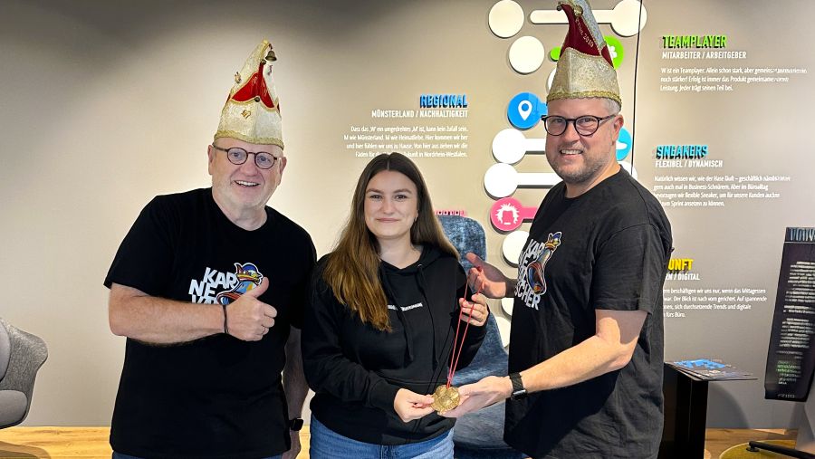 Mit einem dreifachen Gescher Helau bedankten sich Präsident Theo Heisterkamp und Günter Schlüter bei der Fa. Wietholt GmbH in Velen bei der Übergabe eines Scanners für die Archivarbeit der Stadtkarnevalisten Gescher e.V.