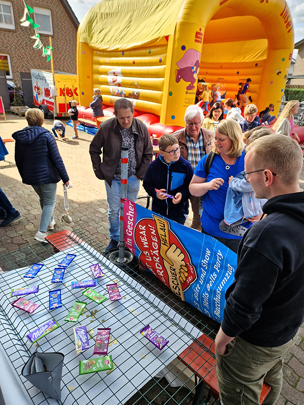 Auf ein tolles Sommerfest bei den Stadtkarnevalisten durften sich Jung und Alt freuen. Und sie wurden nicht enttäuscht. Bei bestem Wetter startete ab 14:30 Uhr in und vor der Karnevalshalle ein buntes Programm mit vielen Highlights. Erstmals dabei war eine Outdoor Dartscheibe, bei der Treffsicherheit mit Klettbällen gefragt war. Begehrt war auch ein Schokoladenspiel: Hier konnte man mit einem 20 Cent-Stück leckere Schokalade gewinnen. Noch mehr zu gewinnen gab es bei einem Schätzspiel: Dabei galt es, die Anzahl kleiner Knopfzellen zu erraten. Es waren fast 2200 Stück. Zu den glücklichen Gewinnern gehörten Ralf Hemsing, Jip Wenning und Philipp Abbing. Sie freuten sich über schöne Preise, einen gemütlichen Liegestuhl mit Getränk und Eisgutschein. Viele Gäste genossen das reichhaltige Kuchen-Buffet, die zahlreichen Kinder zogen es eher auf die große Hüpfburg. Bis plötzlich, bei fetziger Musik die Minigarde vor die Halle trat. Es war ein wirkliches Highlight: Die Sonne leuchtete auf die bunten Kostüme der Kinder. Der Tanz mit toller Choreographie, sogar Radschlag der Tänzerinnen, erntete viel Applaus und nach der Zugabe gab es als Dankeschön vom Sommerfest-Team einen Gutschein für ein Pizza-Essen. Nach einer Stärkung durch "Eis für alle Kinder" wurde weiter gespielt. Auch unter dem Karnevals-Pavillon konnten schöne Masken gebastelt werden. Dann hieß es, runter von der Hüpfburg, der Zauberer Endrik Thier kommt. Und er zog alle, besonders aber die staunenden Kinder in seinen Bann. Er verblüffte sie mit Zaubertricks und viele fragten sich, wie macht er das? Am späten Nachmittag gab es noch Leckeres vom Grill. Und während sich die Kinder auf der Hüpfburg austobten, ließen andere den Tag bei dem ein oder anderen Getränk nett ausklingen.