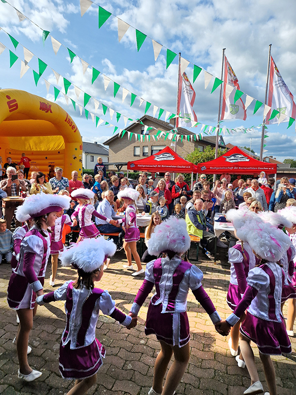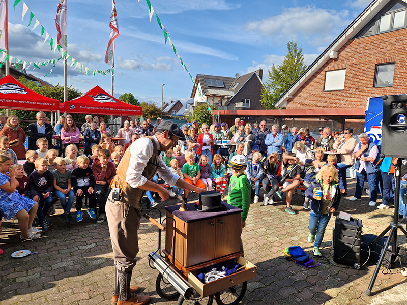 Auf ein tolles Sommerfest bei den Stadtkarnevalisten durften sich Jung und Alt freuen. Und sie wurden nicht enttäuscht. Bei bestem Wetter startete ab 14:30 Uhr in und vor der Karnevalshalle ein buntes Programm mit vielen Highlights. Erstmals dabei war eine Outdoor Dartscheibe, bei der Treffsicherheit mit Klettbällen gefragt war. Begehrt war auch ein Schokoladenspiel: Hier konnte man mit einem 20 Cent-Stück leckere Schokalade gewinnen. Noch mehr zu gewinnen gab es bei einem Schätzspiel: Dabei galt es, die Anzahl kleiner Knopfzellen zu erraten. Es waren fast 2200 Stück. Zu den glücklichen Gewinnern gehörten Ralf Hemsing, Jip Wenning und Philipp Abbing. Sie freuten sich über schöne Preise, einen gemütlichen Liegestuhl mit Getränk und Eisgutschein. Viele Gäste genossen das reichhaltige Kuchen-Buffet, die zahlreichen Kinder zogen es eher auf die große Hüpfburg. Bis plötzlich, bei fetziger Musik die Minigarde vor die Halle trat. Es war ein wirkliches Highlight: Die Sonne leuchtete auf die bunten Kostüme der Kinder. Der Tanz mit toller Choreographie, sogar Radschlag der Tänzerinnen, erntete viel Applaus und nach der Zugabe gab es als Dankeschön vom Sommerfest-Team einen Gutschein für ein Pizza-Essen. Nach einer Stärkung durch "Eis für alle Kinder" wurde weiter gespielt. Auch unter dem Karnevals-Pavillon konnten schöne Masken gebastelt werden. Dann hieß es, runter von der Hüpfburg, der Zauberer Endrik Thier kommt. Und er zog alle, besonders aber die staunenden Kinder in seinen Bann. Er verblüffte sie mit Zaubertricks und viele fragten sich, wie macht er das? Am späten Nachmittag gab es noch Leckeres vom Grill. Und während sich die Kinder auf der Hüpfburg austobten, ließen andere den Tag bei dem ein oder anderen Getränk nett ausklingen.